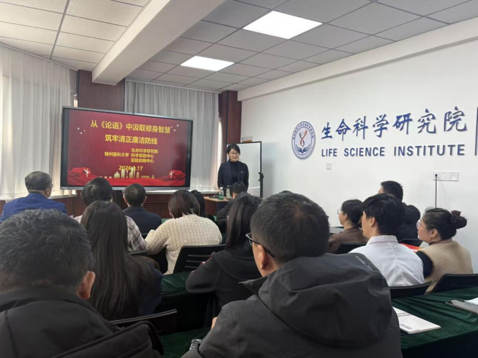 为深入推进党纪学习教育与新时代廉洁文化建设,持续加强师德师风与科研诚信建设,近日,锦州医科大学生命科学研究院联合党支部举办专题党课报告会。学校党委常委、纪委书记葛洪源以从《论语》中汲取修身智慧,筑牢清正廉洁防线为题作专题授课。生命科学研究院院长张毓、党支部书记张华及支部全体党员、无党派人士、党外代表人士、普通教职工共同参加学习。